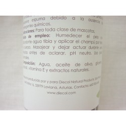 Modo de empleo: Humedecer el pelo con abundante agua tibia y aplicar el champú por todo el cuerpo. Masajear hasta conseguir espuma y dejar actuar durante unos minutos antes de aclarar. pH neutro. Uso para animales.