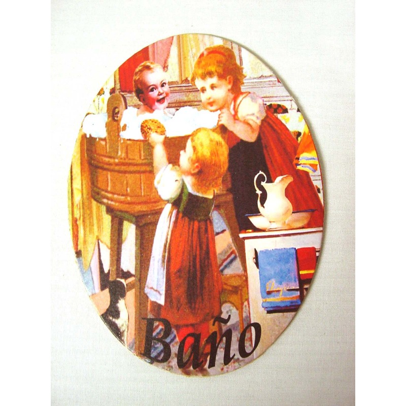 PLACA MADERA OVAL BAÑO NIÑOS ANTIGUO