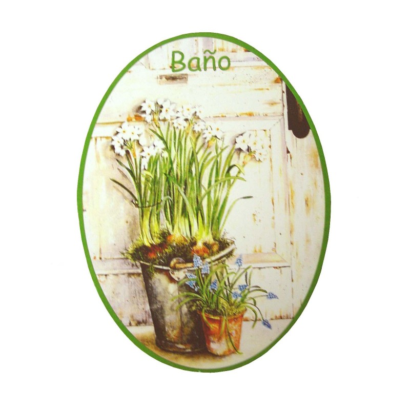 PLACA MADERA OVAL BAÑO FLORES VERDE