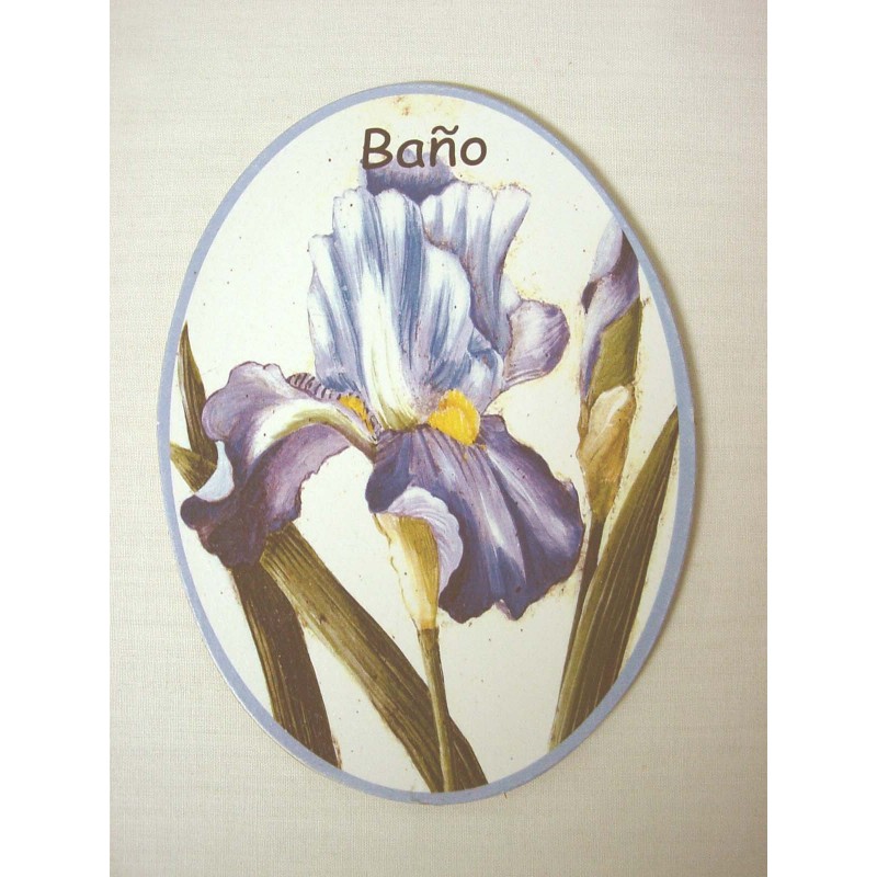 PLACA MADERA OVAL BAÑO FLORES AZULES